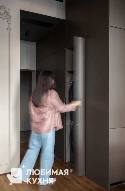 Кухня вне времени: Искусство утонченного минимализма.В этой кухне царит атмосфера утонченного минимализма, где каждый элемент продуман до мелочей. Серые матовые фасады шкафов создают монолитное пространство, сливаясь с фоновой плиткой под мрамор с выразительными прожилками. Акцент делается на подвесном модуле над рабочей зоной, выполненном с четкой вертикальной фрезеровкой, напоминающей строгий шрифт или ритмичный рисунок. Центральным элементом, вносящим в интерьер нотку природной текстуры, выступает кухонный остров. Черный смеситель с лаконичным изгибом идеально гармонирует с рабочей поверхностью и встроенной техникой.