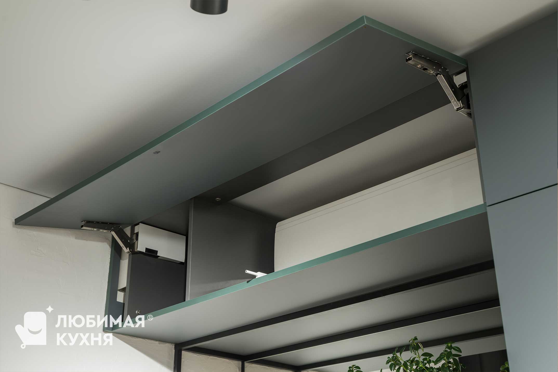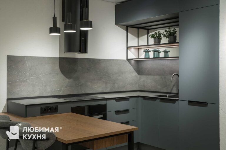 Сдержанная и минималистичная кухня прекрасно впишется как в квартиру, так и в домик за городом. Для данной модели подобраны только самые практичные материалы — фасады кухни облицованы пластиком, который невероятно прост в уходе и способен выдерживать влагу и загрязнения. Верх кухни облегченный — полки из металлического профиля сохраняют функциональность и сохраняют воздушность. А так же в кухне предусмотрены пенал для встроенного холодильника и интегрированный обеденный стол, что очень удобно для пространств с ограниченной площадью.