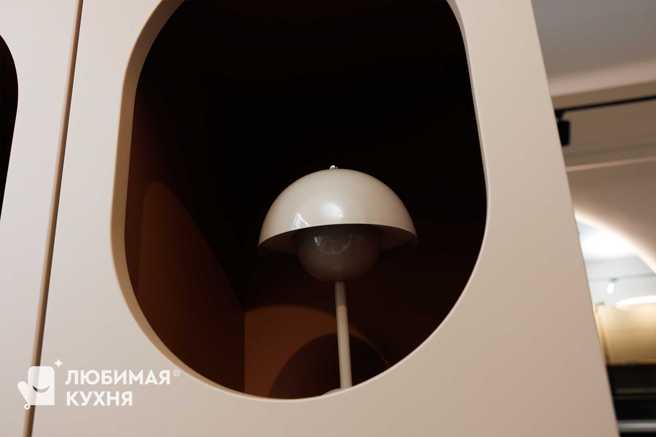 Креативная мебель для детской в мягком бежевом оттенке с игривыми нишами терракотового цвета. Шкаф сочетает закрытые шкафы и открытые полки необычных форм — для хранения игрушек, книг и декора. Стол с деревянной столешницей создают уютную зону для занятий. Функциональное решение, которое стимулирует воображение ребёнка и органично вписывается в современный интерьер.