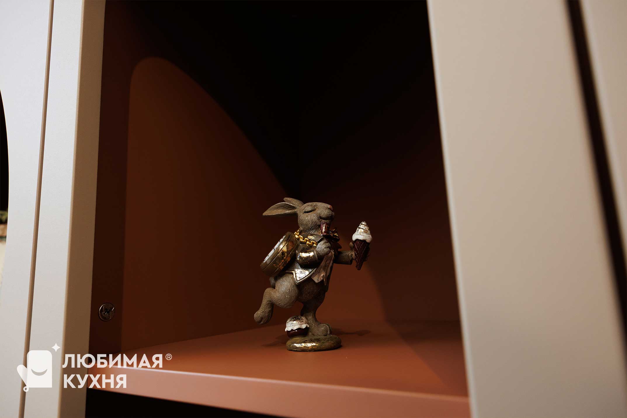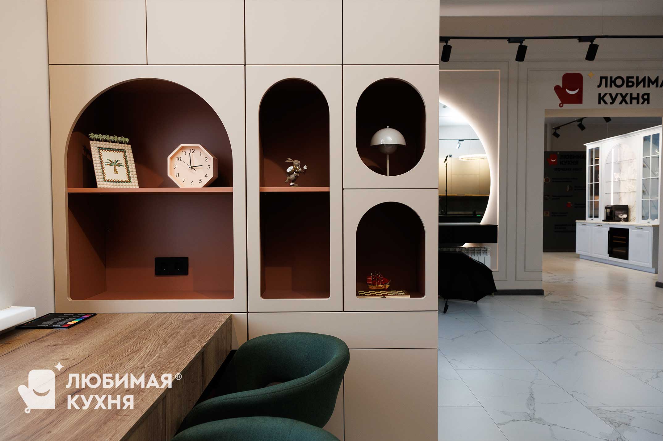 Двери: фасады шкафа ТРП Софт коф, фреза Макондо, фреза Маркез, полки серия Eterno, цвет ETM20 Matt Nevada, стол ЛДСП Галифакс табак